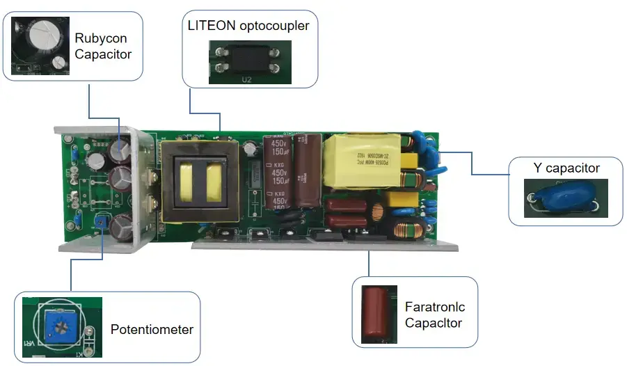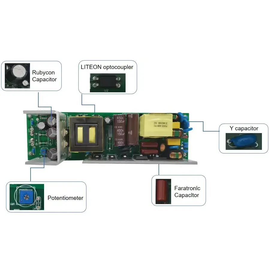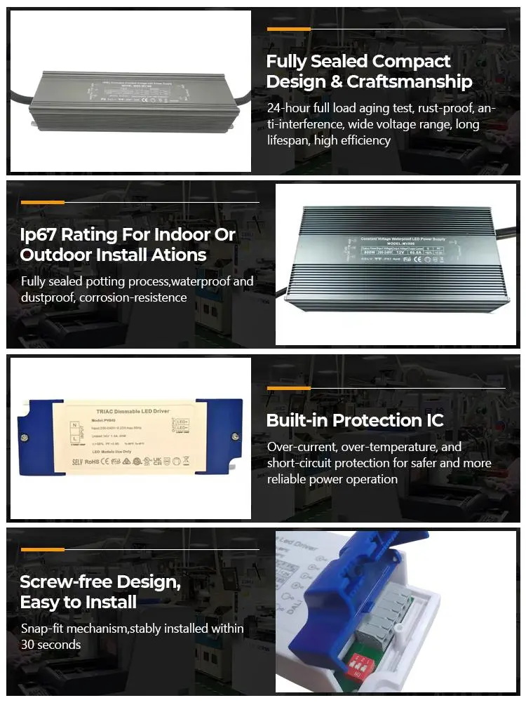 Precyzyjny prąd stały · Długotrwała trwałość: Sterownik LED stałoprądowy STARWELL z triakiem i ściemniaczem wykorzystuje precyzyjny chip prądu stałego. Błąd prądu wyjściowego wynosi ≤ ±3%, prąd wyjściowy jest stabilny na poziomie 1200 mA, a głębokość migotania wynosi <5%, eliminując w ten sposób problemy migotania i tłumienia światła. Może wydłużyć żywotność opraw oświetleniowych LED o ponad 30%, a jej ciągła żywotność może osiągnąć 50 000 godzin, co znacznie zmniejsza koszty wymiany i konserwacji.