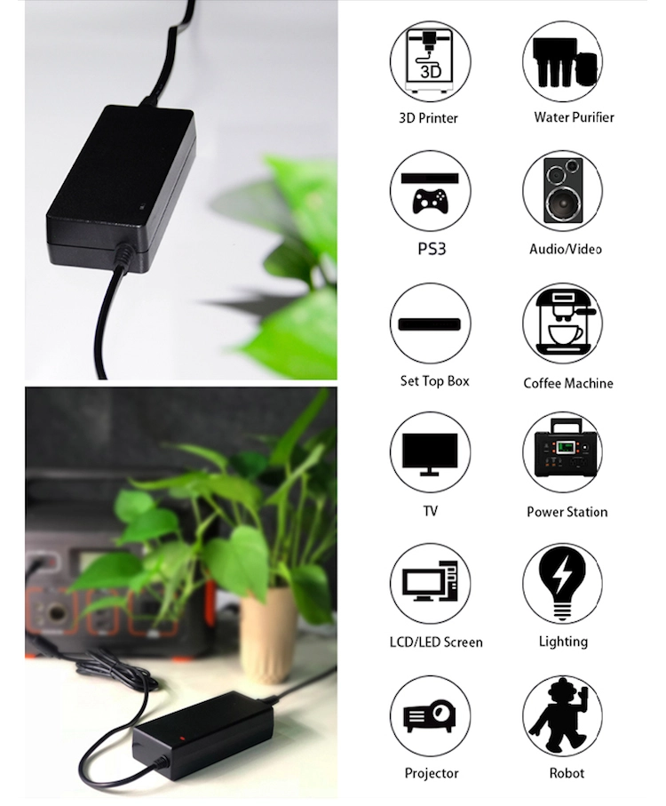 * Więcej jednostek dla serii 120 W: dostępne 12 V/15 V/20 V/24 V/36 V/48 V * Bezpieczeństwo: OCP/OVP/OTP, SCP, automatyczne odcięcie przeciążeniowe, odcięcie przepięciowe, automatyczne odcięcie termiczne. * Szeroka kompatybilność: taśmy LED, drukarka 3D, nadajnik-odbiornik radiowy, kamery CCTV, samochodowy wzmacniacz subwoofera, wzmacniacz audio, router bezprzewodowy, koty ADSL, nawilżacz, koncentrator, klawiatura, głośnik BT, monitor, kamera internetowa, DVR, NVR, zasilacz audio/wideo