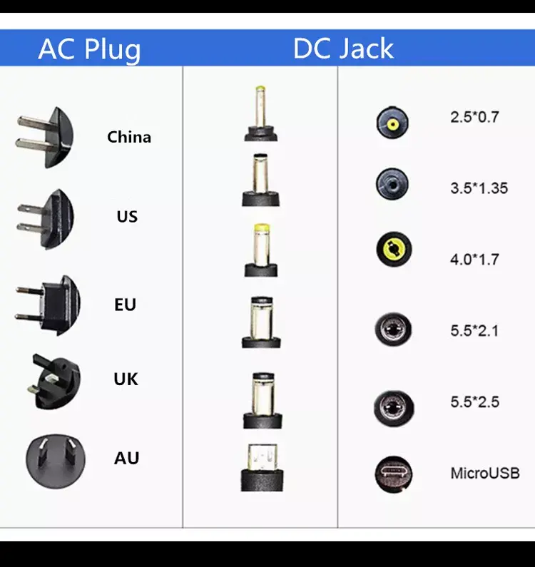 Typ złącza: Standardowe złącze baryłkowe DC (typowe rozmiary to 5,5 mm × 2,1 mm lub 5,5 mm × 2,5 mm, można je dostosować w zależności od wymagań urządzenia).