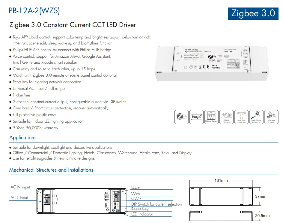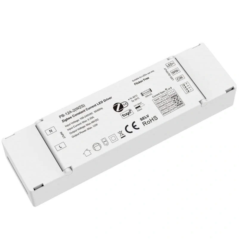 Ściemnialne sterowniki LED TUYA Zigbee CCT o mocy 12 W charakteryzują się wysoką wydajnością konwersji do 85%, współczynnikiem mocy ≥ 0,90 i niskim poborem mocy bez obciążenia, skutecznie redukując straty energii. Wbudowane pełne zabezpieczenia, w tym przepięcie, przetężenie, zwarcie i nadmierna temperatura, zapewniają bezpieczną i stabilną pracę. Dzięki kompaktowej i ognioodpornej obudowie jest szeroko stosowany w inteligentnych systemach oświetlenia białego w inteligentnych domach, hotelach, biurach i sklepach detalicznych, zapewniając niezawodne i przyjazne dla użytkownika inteligentne przyciemnianie.