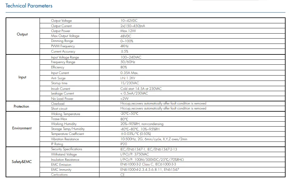 Dzięki uniwersalnemu wejściu 100 ~ 240 V AC sterownik CCT Dimmable LED Driver dostosowuje się do globalnych sieci energetycznych. Wysoka sprawność do 85% i współczynnik mocy ≥0,90, niższe zużycie energii i wytwarzanie ciepła, wydłużając żywotność zarówno sterownika, jak i diody LED.