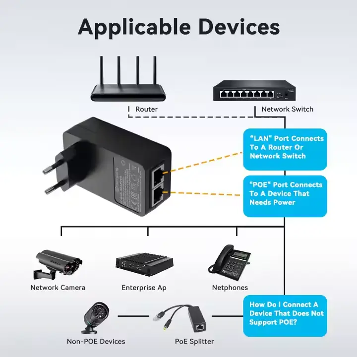 Adapter POE o mocy 12 W z wymienną wtyczką, wtryskiwacz POE jest szeroko stosowany w różnych środowiskach sieciowych i związanych z bezpieczeństwem:
