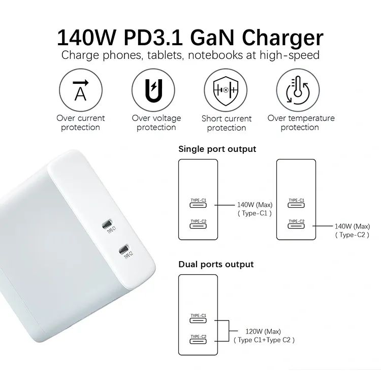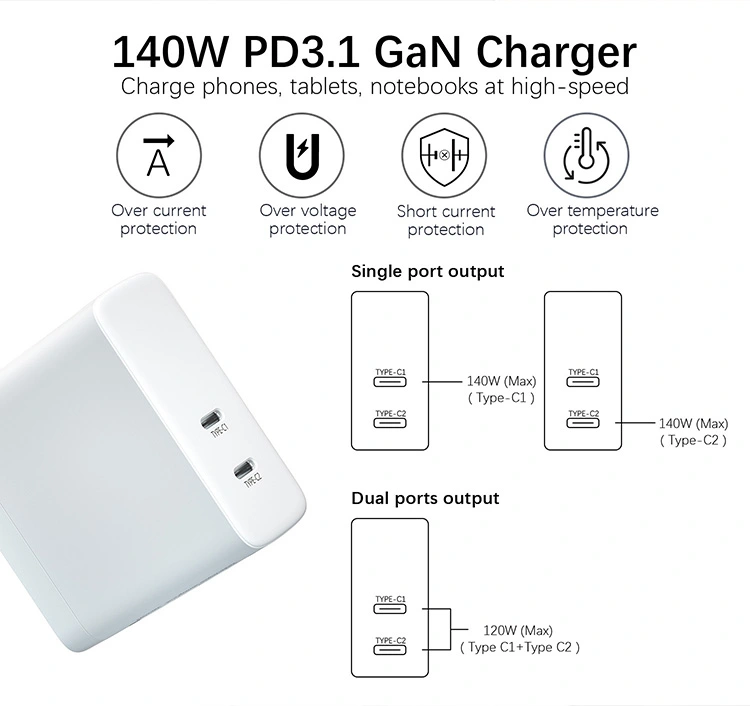 GAN: Dzięki chipom GaN rozmiar ładowarki PD 140 W jest zmniejszony o 50% w porównaniu z tradycyjnymi ładowarkami, dzięki czemu można ją łatwo przenosić w podróż służbową lub do użytku biurowego, bez zajmowania miejsca w gniazdku elektrycznym.