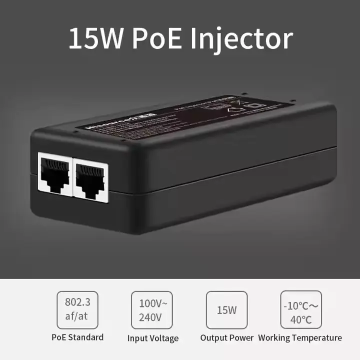 Ten adapter PoE o mocy 15 W IEEE 802.3af, obsługujący napięcie globalne 100–240 V, działa na całym świecie. W połączeniu z transmisją PoE na odległość 100 metrów umożliwia elastyczną instalację i jest szeroko stosowany jako stabilny wtryskiwacz PoE do komputerów stacjonarnych w systemach nadzoru i sieci.