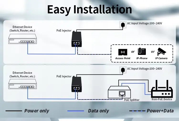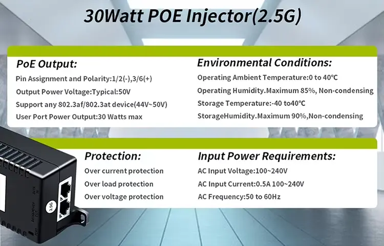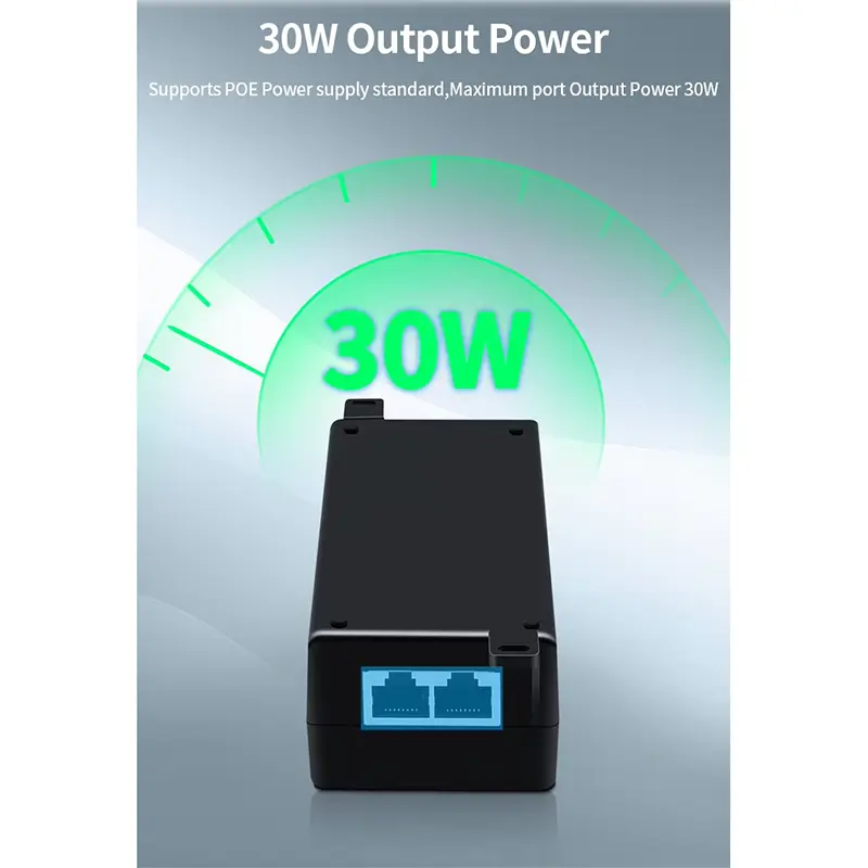 Ten 30-watowy wstrzykiwacz Poe obsługuje wiele standardów PoE, dzięki czemu jest elastycznym wyborem dla różnych urządzeń.