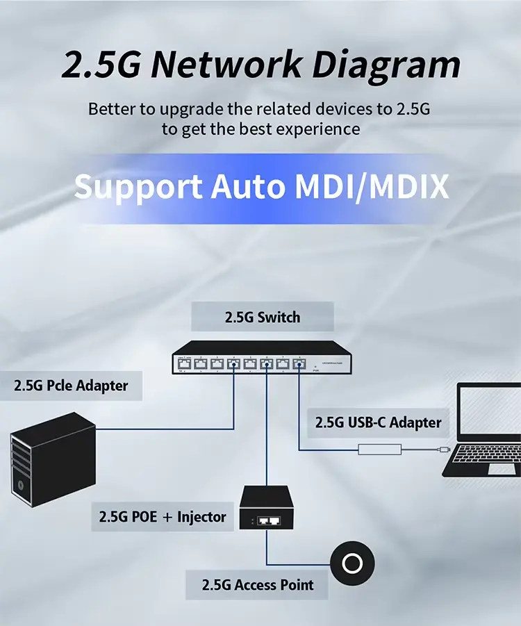 Wyprzedź krzywą przepustowości dzięki obsłudze prędkości transmisji danych 2,5 Gb/s i pełnej kompatybilności wstecznej z urządzeniami 10/100/1000 Mb/s.