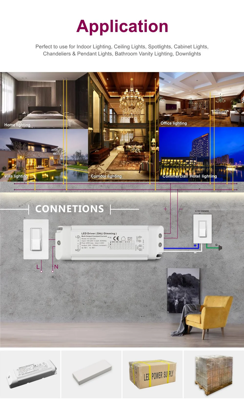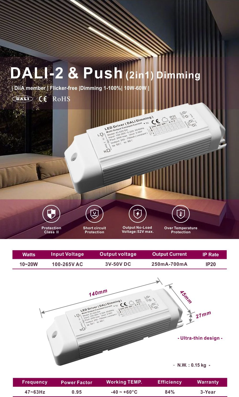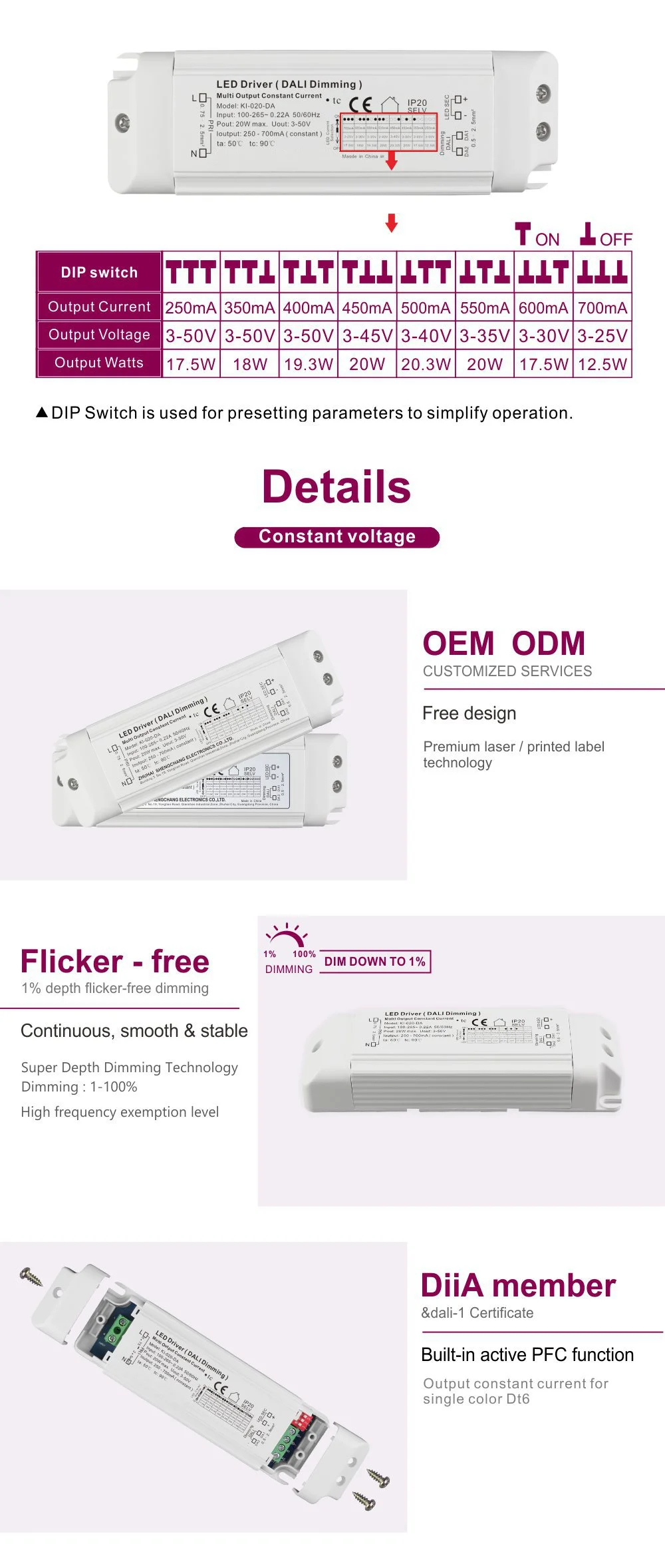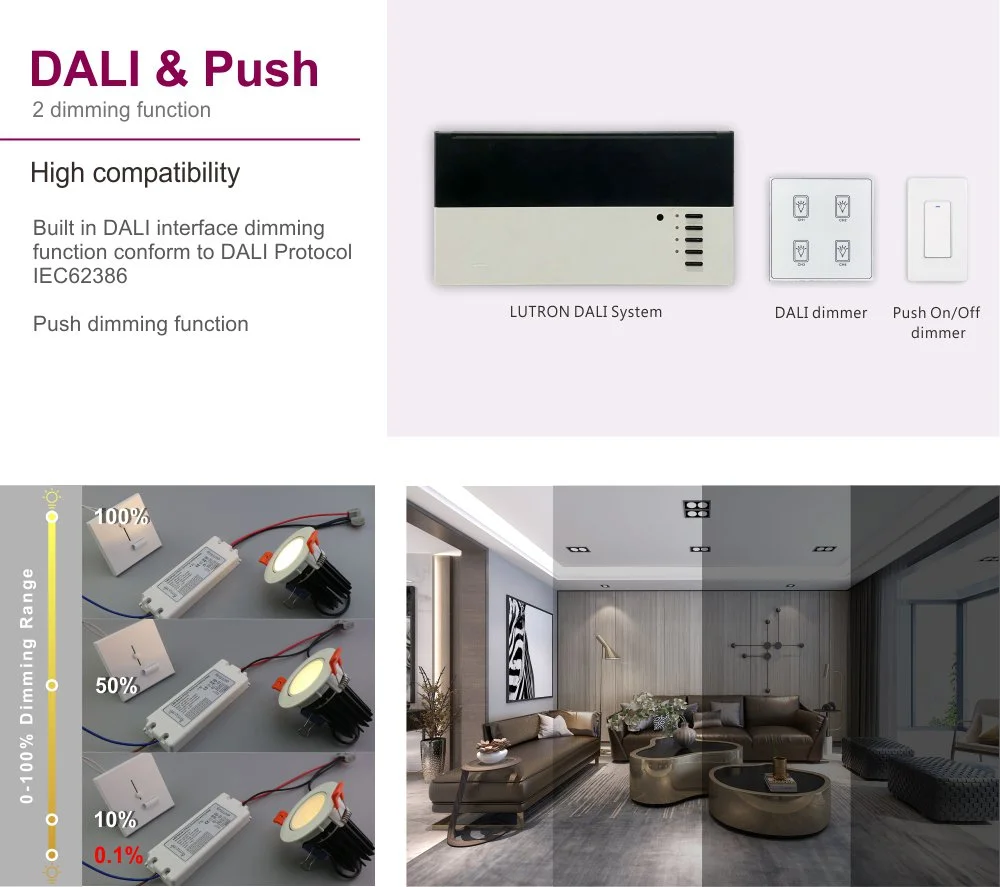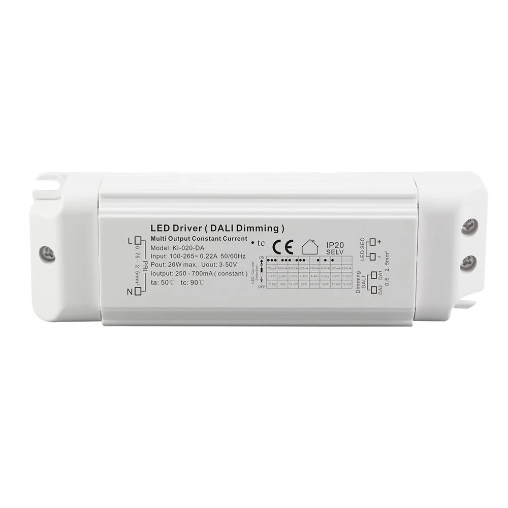 Jako niezawodny ściemnialny zasilacz stałoprądowy Dali o mocy 20 W do lamp LED, zapewnia czysty i pozbawiony migotania prąd stały dla modułów LED lub pasków świetlnych. W obudowie produktu zastosowano ściemnialny sterownik LED o mocy 20 W AC-DC, plastikową obudowę stałoprądową do oświetlenia LED, charakteryzującą się zwartą i solidną konstrukcją o doskonałej wydajności rozpraszania ciepła i obsługującą zarówno instalację wbudowaną, jak i zewnętrzną.