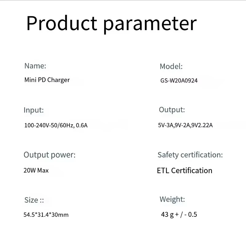 Specyfikacja ładowarki PD o mocy 20 W w wersji japońskiej: