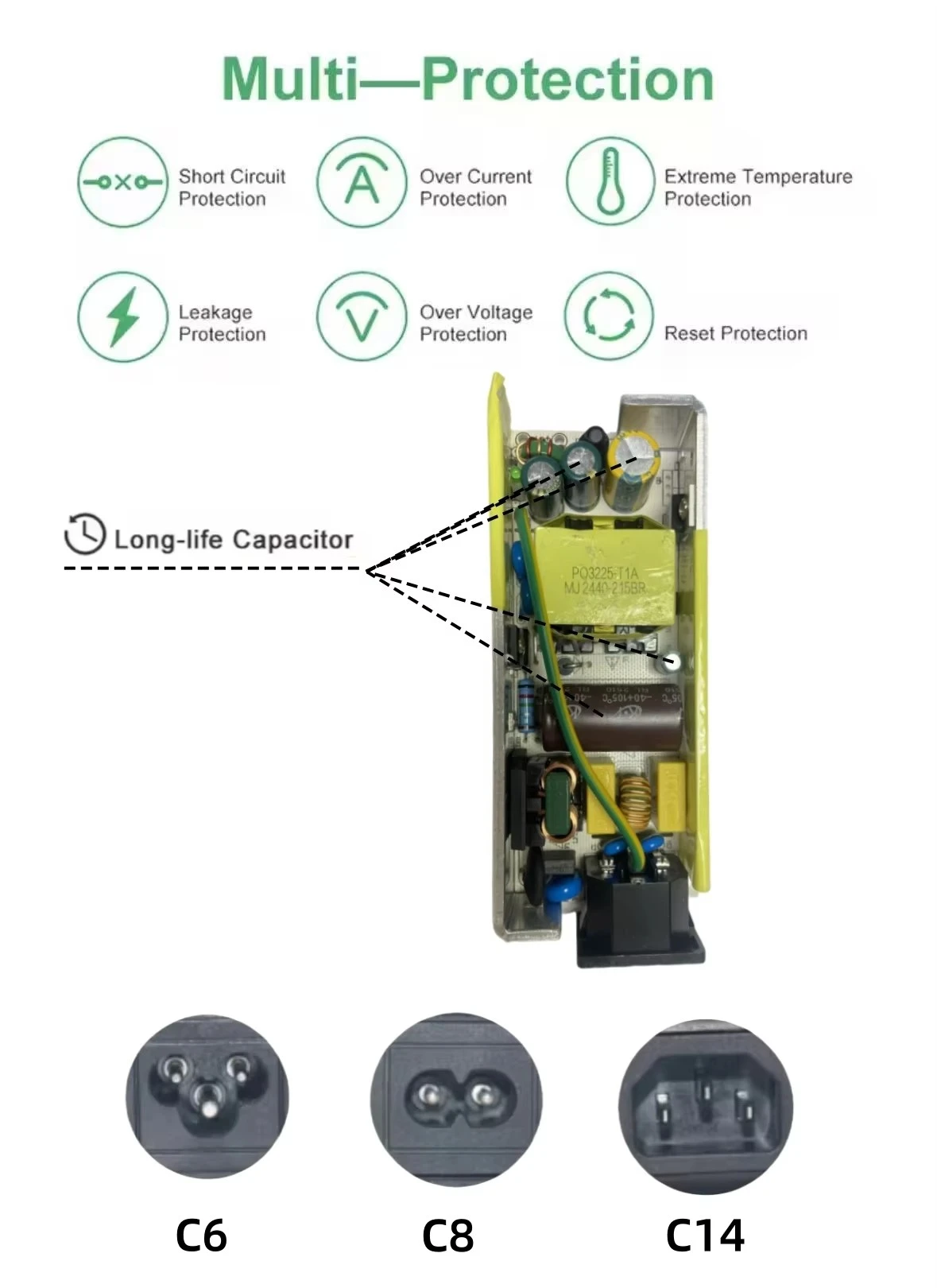 Kompleksowe zabezpieczenia: Zintegrowane zabezpieczenia, w tym zabezpieczenie nadprądowe (OCP), zabezpieczenie nadnapięciowe (OVP) i zabezpieczenie przed zwarciem (SCP), zapobiegają uszkodzeniom zarówno zasilacza, jak i cennego sprzętu.
