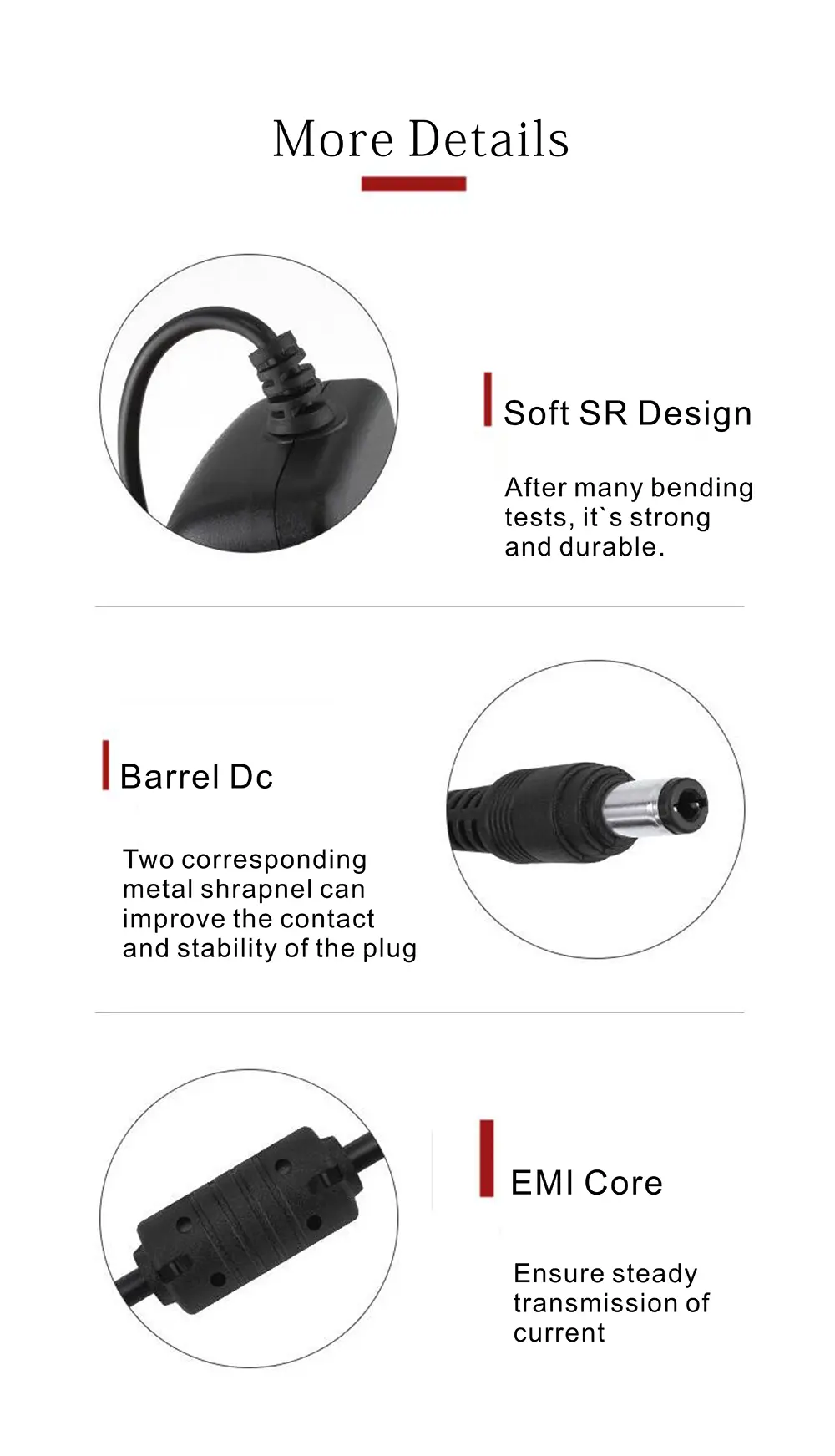 3. Dopasowanie złącza: Sprawdź, czy rozmiar wtyczki (np. 5,5 mm x 2,1 mm) i polaryzacja (często dodatnia na środku) odpowiadają gniazdu prądu stałego urządzenia. Niedopasowanie może spowodować uszkodzenie.