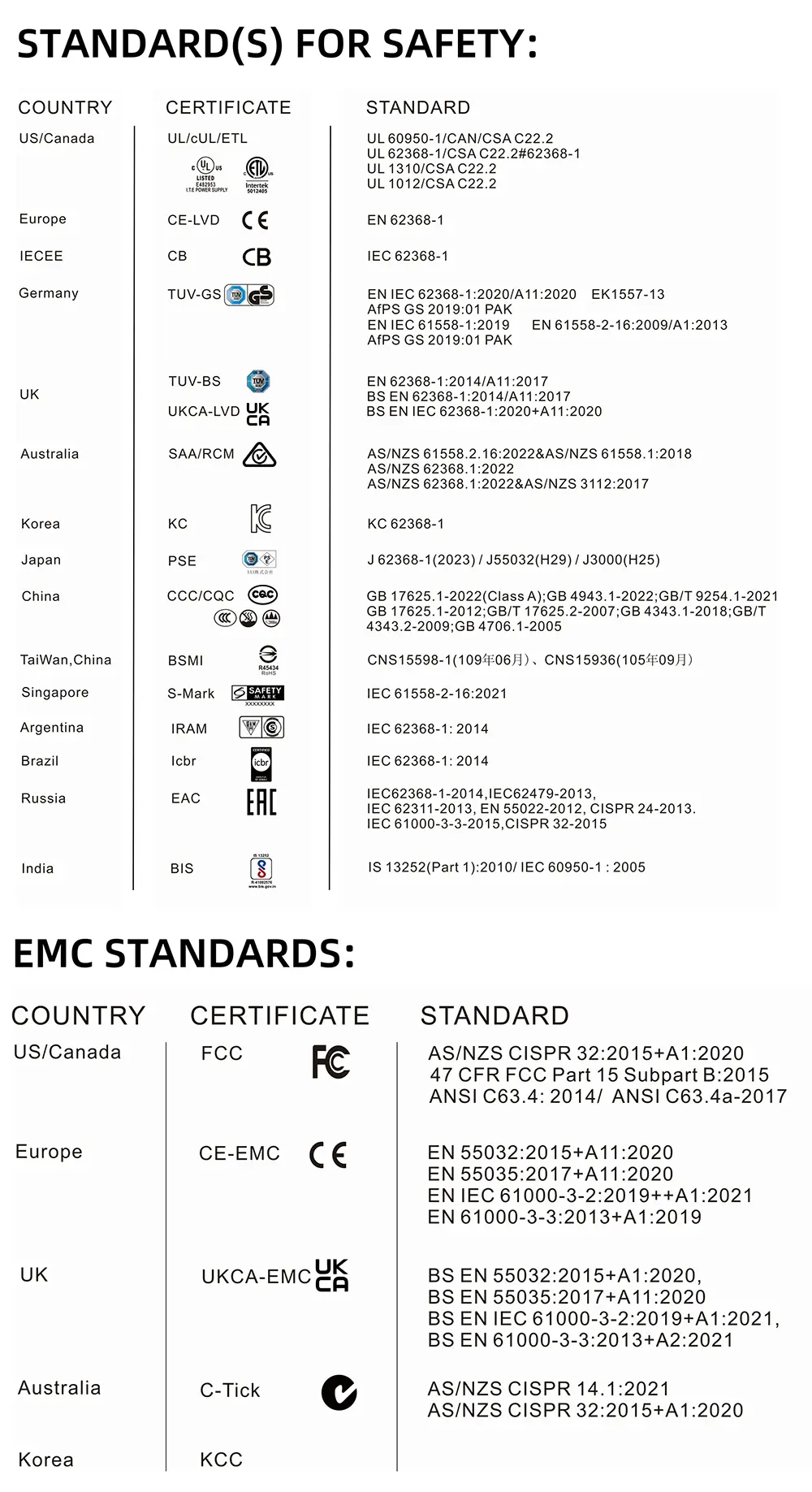 Twoje bezpieczeństwo jest najważniejsze. Ten adapter został zaprojektowany i wyprodukowany zgodnie z rygorystycznymi normami międzynarodowymi, zapewniając nie tylko niezawodne działanie, ale także spokój ducha. Jest zgodny z ETL CE FCC TUV GS CB PSE KC KCC BIS SAA RCM c-Tick CCC UKCA UL cUL RoHS , które regulują bezpieczeństwo, zdrowie i ochronę środowiska.