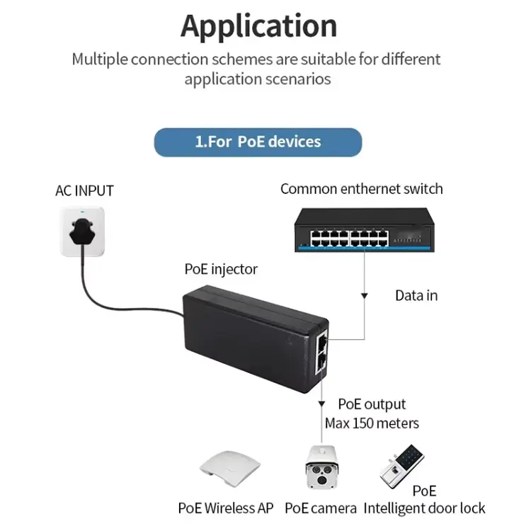 Ten wewnętrzny wzmacniacz Poe o mocy 24 W i standardowy wzmacniacz POE 10/100/1000 Mb/s to ekonomiczne rozwiązanie w zakresie zasilania dostosowane do zasięgu sieci bezprzewodowej i systemów monitorowania bezpieczeństwa. Jako wewnętrzne urządzenie zasilające PoE, może być używane w połączeniu ze standardowymi przedłużaczami PoE 10/100/1000Mbps w celu uzyskania transmisji sygnałów sieciowych na duże odległości. Zasilacz ten wykorzystuje technologię pasywnego zasilania, eliminując potrzebę skomplikowanych procesów negocjacji uzgadniania i bezpośrednio dostarcza energię do zdalnych urządzeń za pośrednictwem kabli Ethernet. Jest szczególnie odpowiedni do bezprzewodowych punktów dostępowych, mostów zewnętrznych i urządzeń transmisyjnych typu punkt-punkt, które obsługują pasywne zasilanie PoE.