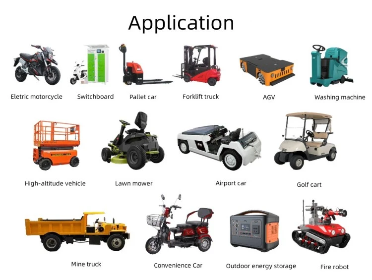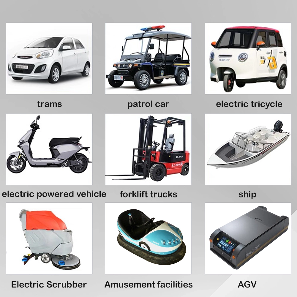 Zastosowania produktu Elektryczne samochodziki i przejażdżki rozrywkowe Pojazdy wycieczkowe i wózki golfowe Pojazdy patrolowe i wózki bezpieczeństwa Wózki widłowe i sprzęt do transportu materiałów Szorowarki i maszyny czyszczące do podłóg Zautomatyzowane pojazdy kierowane (AGV) do magazynów Statki elektryczne, łodzie i morskie statki użytkowe