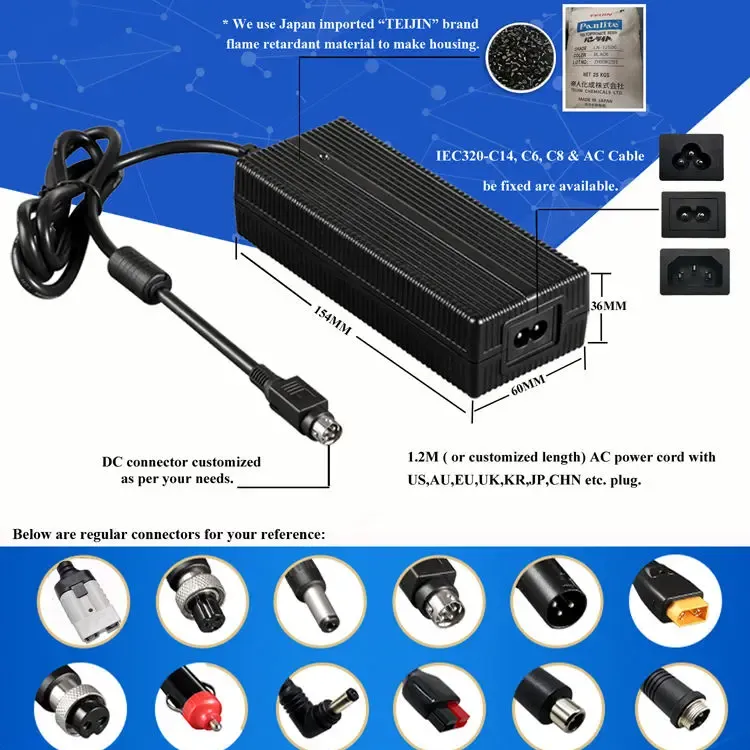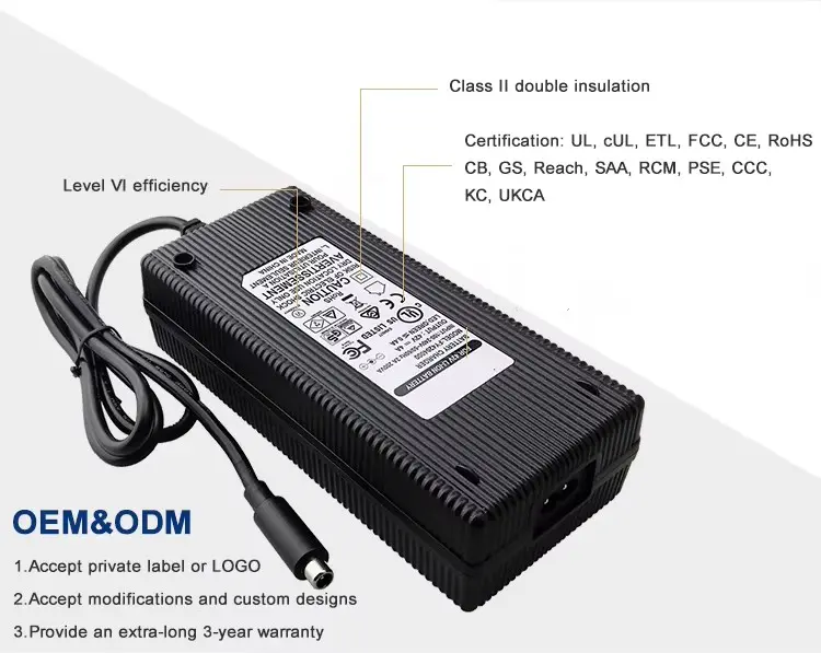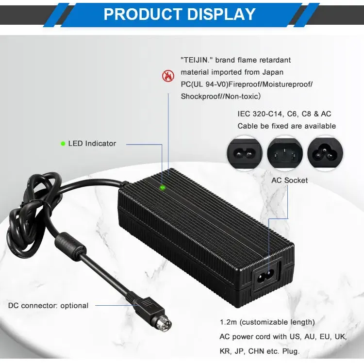 Globalna kompatybilność i elastyczna konstrukcja: Zbudowana z uniwersalnego zakresu wejściowego prądu przemiennego 100–240 V AC, 50/60 Hz, ta ładowarka może być używana na całym świecie. Oferuje wiele opcji gniazd wejściowych prądu przemiennego (IEC320-C14, C6, C8) i jest wyposażony w przewód zasilający o długości 1,2 m, który można dostosować za pomocą wtyczek dla USA, Australii, UE, Wielkiej Brytanii, KR, JP, CHN i innych wtyczek regionalnych. Obudowa wykonana jest z ognioodpornego materiału PC, co zapewnia trwałość i bezpieczeństwo w różnych warunkach pracy.