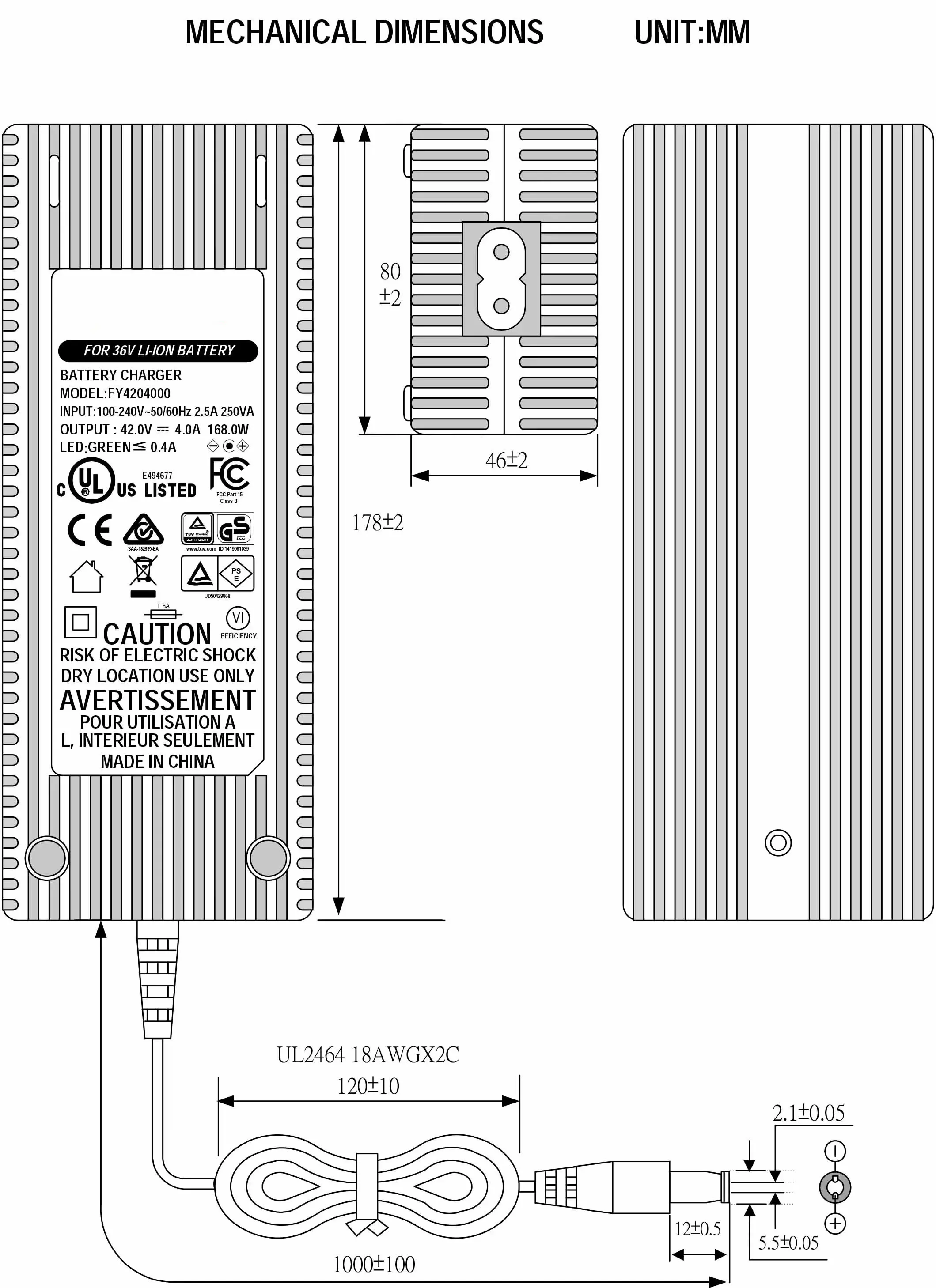 Kompleksowa ochrona i certyfikaty: Bezpieczeństwo jest najważniejsze. Ładowarka akumulatora do skutera 42 V 4 A jest wyposażona w solidne mechanizmy zabezpieczające, w tym zabezpieczenie przed zwarciem, przepięciem, przegrzaniem i przeciążeniem, a także testowanie HIPOT do 4200 V dla dodatkowego bezpieczeństwa izolacji. Działa wydajnie przy skuteczności >89% i posiada obszerną listę światowych certyfikatów: UL, CUL, GS, CE, BS, SAA, KC, PSE, CB, FCC, EMC, ROHS i REACH, zgodnych z normami bezpieczeństwa, takimi jak UL60950, IEC60950 i IEC60335.