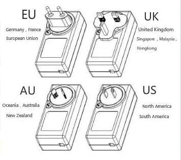 Typ wtyczki AC | USA/UE/UK/AU lub więcej | |