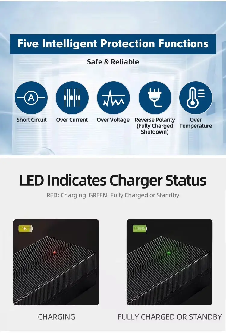Globalna kompatybilność i solidne bezpieczeństwo: Wyposażony w uniwersalne wejście 100–240 V AC, działa bezproblemowo na całym świecie. Zaawansowane, trójstopniowe inteligentne ładowanie (CC/CV) optymalizuje stan akumulatora, a kompleksowe zabezpieczenia — w tym zwarcie, przepięcie, nadmierna temperatura i przeciążenie — zapewniają bezpieczną i bezproblemową pracę. Trwała obudowa jest wykonana z materiałów ognioodpornych, co zapewnia większą niezawodność w wymagających środowiskach.