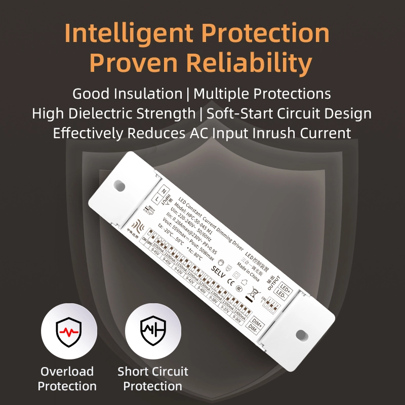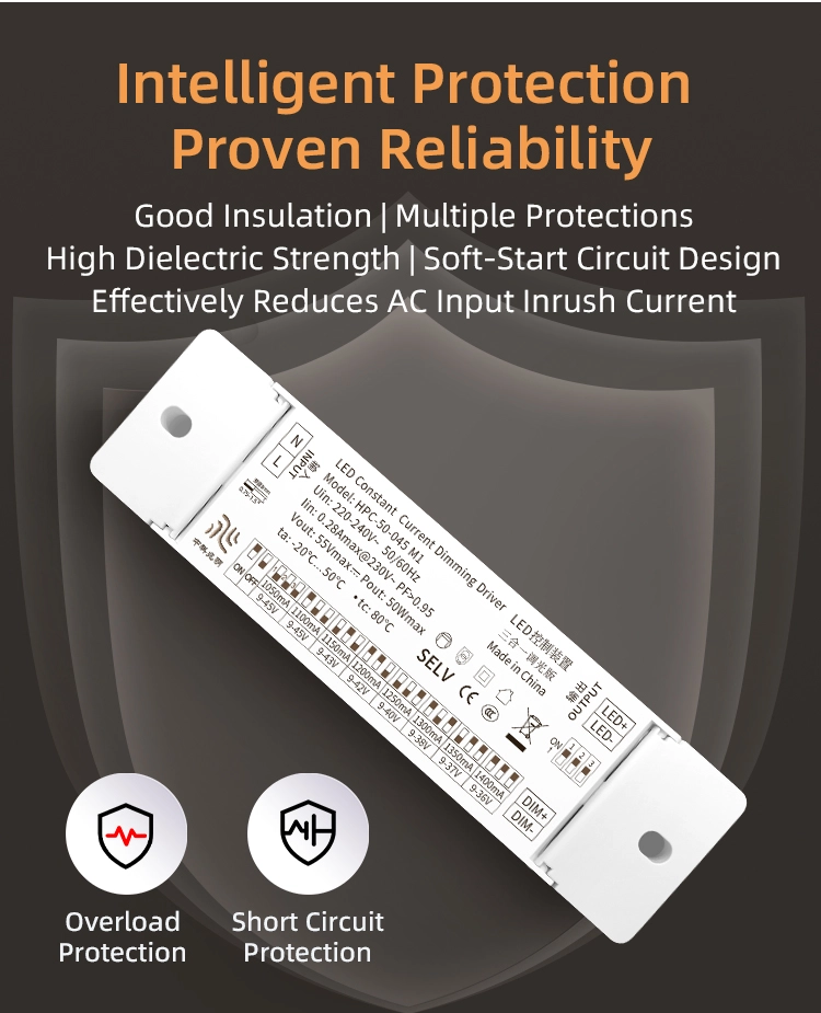Konstrukcja z wieloma zabezpieczeniami: Zbudowana z czterech mechanizmów zabezpieczających: przepięcie (próg ochrony ≥55 V), przetężenie (próg ochrony ≥0,18 A), zwarcie i przegrzanie (temperatura ochrony ≥110 ℃). Może szybko odciąć wyjście w przypadku nietypowych warunków pracy, aby chronić sterownik i źródła światła LED przed uszkodzeniem.