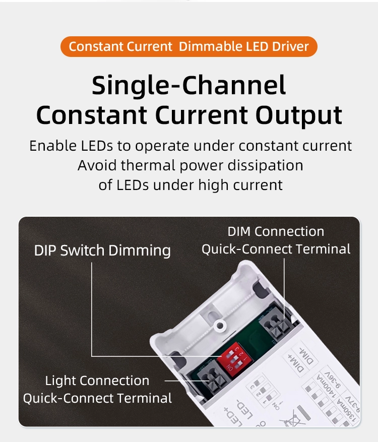 Tryby podwójnego przyciemniania: Sterownik LED przyciemniający prąd stały obsługuje wejście sygnału podwójnego przyciemniania 0-10 V/1-10 V. Zakres ściemniania wynosi 0-100%, z liniowością ściemniania ≥95%. Może osiągnąć płynne i płynne przejście od przyciemnienia do pełnej jasności bez żadnych drgań i opóźnień przy przyciemnianiu. Jest kompatybilny z różnymi inteligentnymi systemami ściemniania i może spełniać wymagania oświetleniowe różnych scenariuszy.