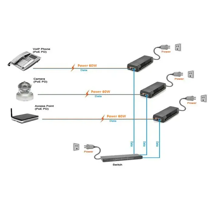 Zapewnia moc wyjściową do 60 W i w pełni obsługuje standardy IEEE 802.3bt/at/af. Zasila zarówno urządzenia o małej mocy (15,4 W), jak i sprzęt o dużej mocy (30 W/60 W), obsługując prawie wszystkie urządzenia zasilane przez Ethernet i zapewniając silną kompatybilność PoE.