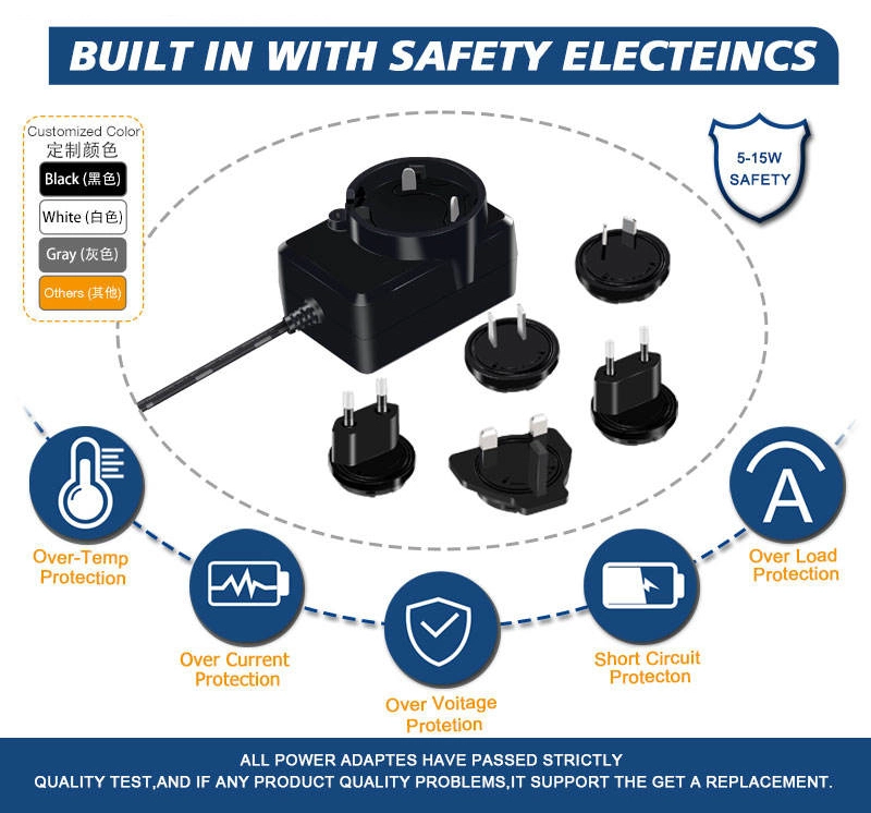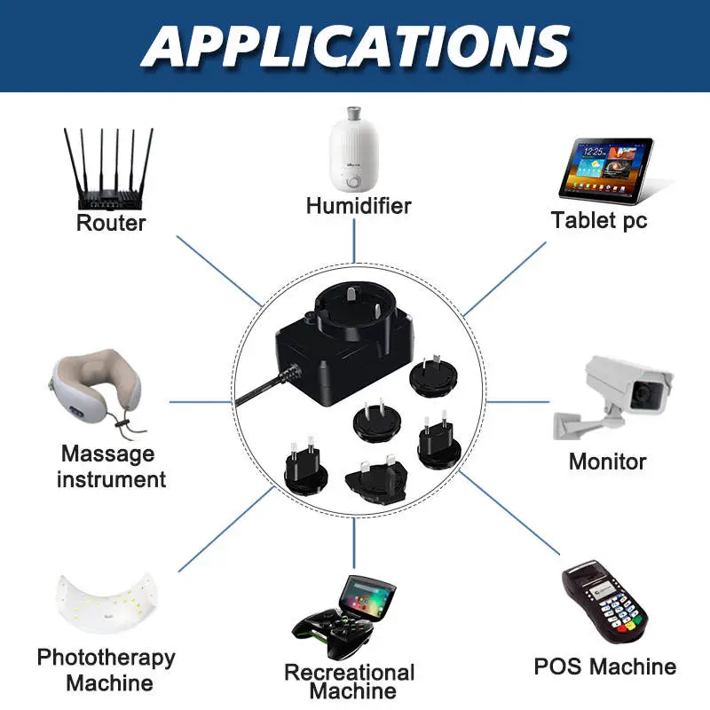Wysokiej jakości wymienny zasilacz sieciowy Starwell to wszechstronne i przenośne urządzenie przeznaczone do konwersji prądu przemiennego (prądu przemiennego) z gniazdka ściennego na stabilne, niskie napięcie prądu stałego (DC) wymagane przez szeroką gamę urządzeń elektronicznych. Jego cechą charakterystyczną jest zestaw odłączanych i wymiennych wtyczek (często nazywanych „wtyczkami AC” lub „wtykami wejściowymi”), które są zgodne z różnymi międzynarodowymi standardami gniazd.