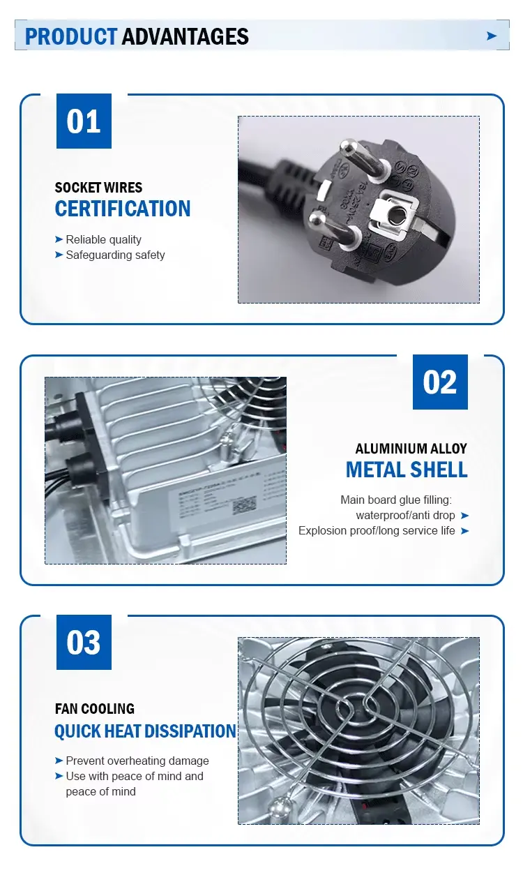 Wysoka wydajność i inteligentna ochrona: Osiągając sprawność do 93% i współczynnik mocy ≥0,98, ładowarka ta minimalizuje straty energii i zmniejsza koszty operacyjne. Wbudowane zabezpieczenia obejmują zabezpieczenie przed przepięciem, zwarciem, odwrotną polaryzacją i przegrzaniem. Wskaźnik LED pozwala na szybki podgląd stanu ładowania.
