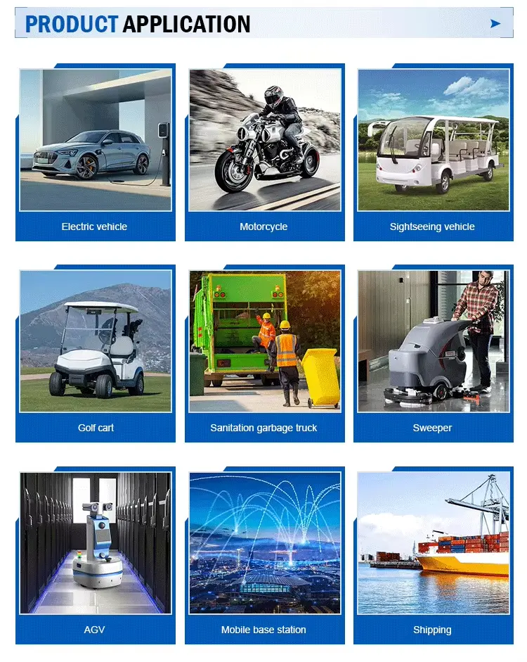 Zastosowanie: Motocykl / skuter, trójkołowy, Cropper, zamiatarka, wózek widłowy, ciężarówka, autobus elektryczny, akumulator kwasowo-ołowiowy, pojazd elektryczny, pojazd wycieczkowy, pojazd logistyczny, pojazd sprzątający, samochód patrolowy, wózki wydmowe, statek, sprzęt komunikacyjny
