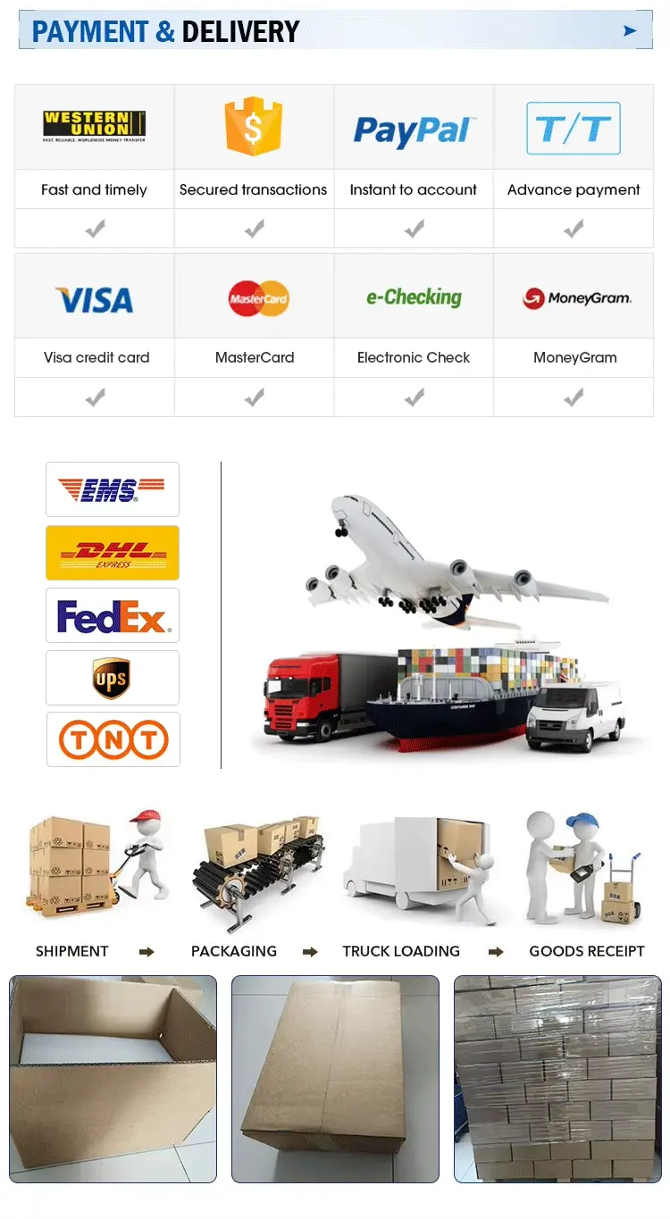 A4: Małe zamówienia wysyłane są ekspresowo (FEDEX, DHL, EMS, TNT). Duże zamówienia wysyłamy drogą morską lub powietrzną. Dostępna cena FOB. Możesz skorzystać ze swojego spedytora lub naszego.