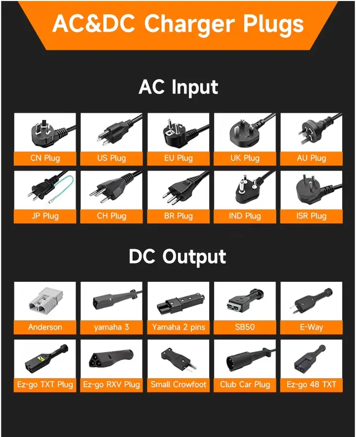 Wtyczka UE, zwykle dla krajów UE, takich jak Niemcy, Francja, Holandia, Dania, Austria, Szwecja itp. Wtyczka brytyjska, zwykle dla Wielkiej Brytanii, Indii, Pakistanu, Singapuru itp. Wtyczka AU, zwykle dla Australii, Nowej Zelandii, Argentyny itp. Do popularnych złączy prądu stałego dostępnych na rynku należą Anderson, EZ-go, DS Club Car i Yamaha Connector itp.
