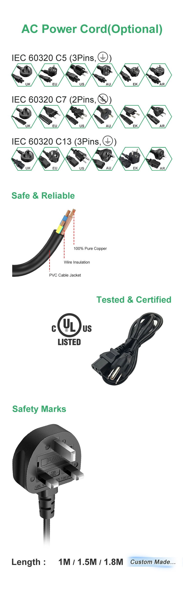 * Więcej jednostek dla serii 200 W: dostępne 5 V/8 V/9 V/12 V/13,5 V/15 V/18 V/19 V/24 V/25 V/30 V/36 V/29 V/30 V/42 V/48 V * Bezpieczeństwo: OCP/OVP/OTP, SCP, automatyczne odcięcie przeciążeniowe, odcięcie przepięciowe, automatyczne odcięcie termiczne. * Szeroka kompatybilność: taśmy LED, drukarka 3D, nadajnik-odbiornik radiowy, kamery CCTV, samochodowy wzmacniacz subwoofera, wzmacniacz audio, router bezprzewodowy, koty ADSL, nawilżacz, koncentrator, klawiatura, głośnik BT, monitor, kamera internetowa, DVR, NVR, zasilacz audio/wideo