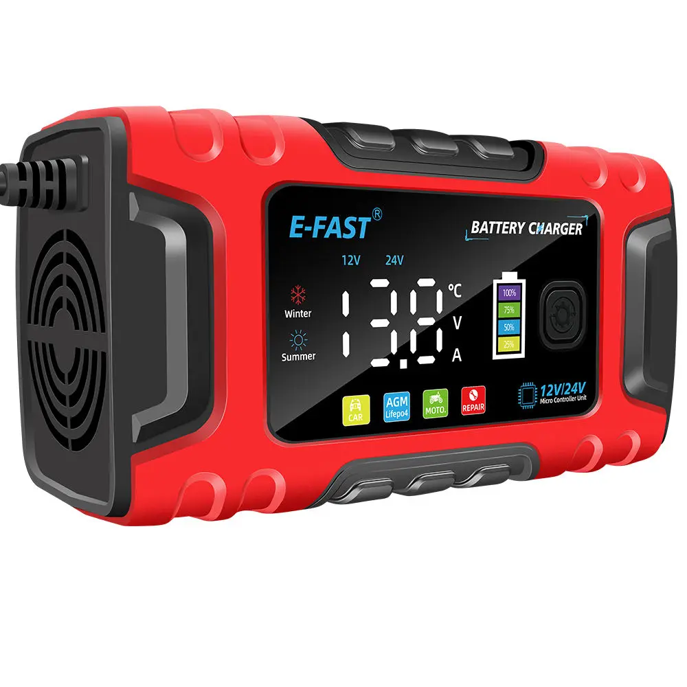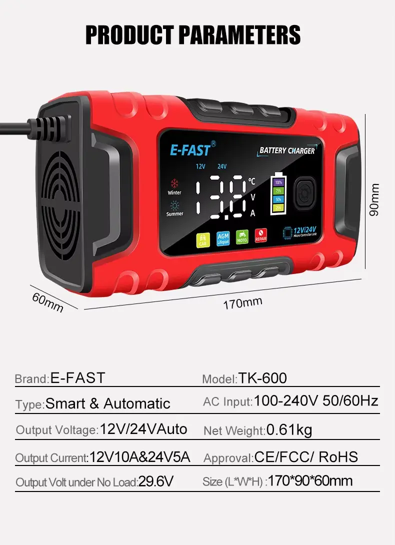 Wysokiej jakości E-Fast TK-600 w pełni automatyczny z technologią naprawy impulsowej 12V10A 24V5A ładowarka akumulatorów kwasowo-ołowiowych lifepo4 do samochodu |
