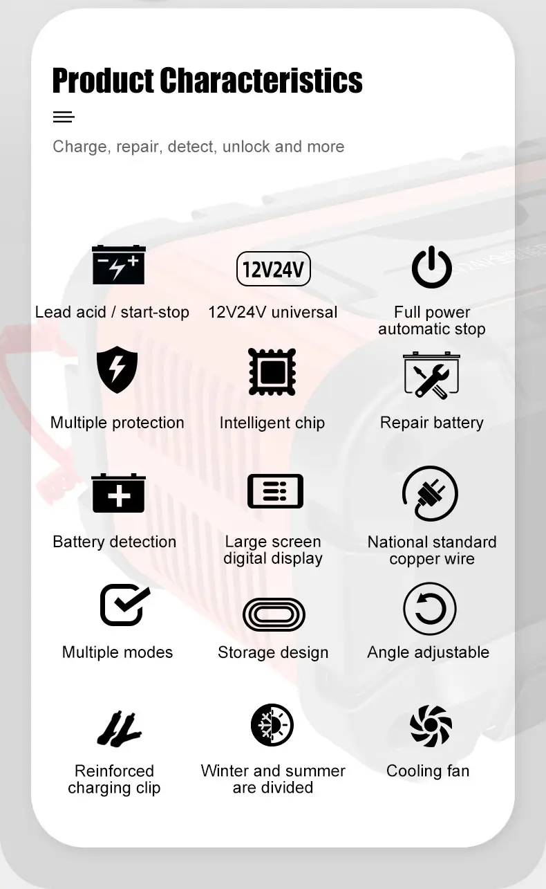 · Inteligentne automatyczne wykrywanie: automatycznie identyfikuje typ baterii i stosuje właściwy tryb ładowania
