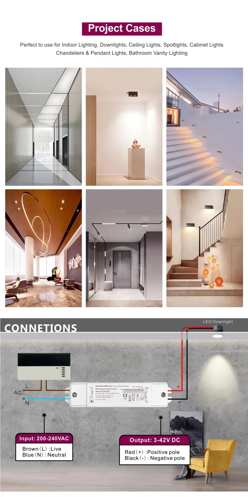 Stabilny i ochronny prąd stały: Utrzymuje precyzyjny, stały prąd wyjściowy modułów LED, zapewniając stałą jasność, jednolitość kolorów i dłuższą żywotność diod LED, chroniąc przed wahaniami prądu i przepięciami.